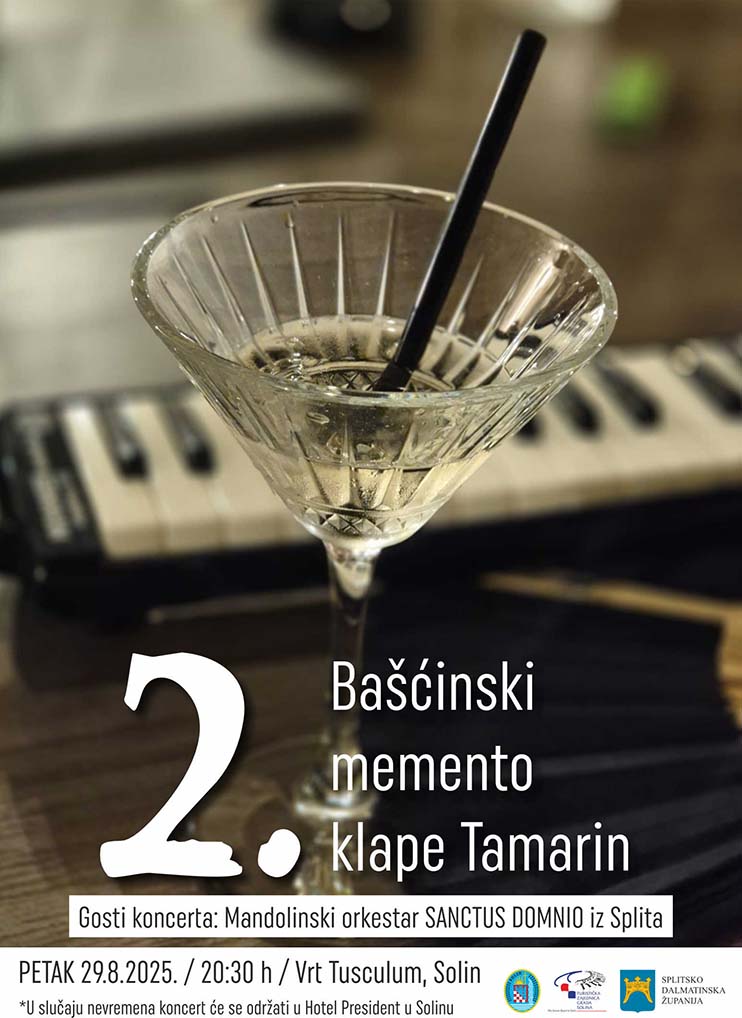 U Solinu se u petak, 29. kolovoza, sa početkom u 20.30 sati u vrtu arheološkog muzeja Tusculum održava druga edicija samostalnog koncerta ženske klape Tamarin pod nazivom “2. Bašćinski memento klape Tamarin“, s napomenom kako će se u slučaju kiše ili jačeg nevremena isti održati u Hotelu President u Solinu.