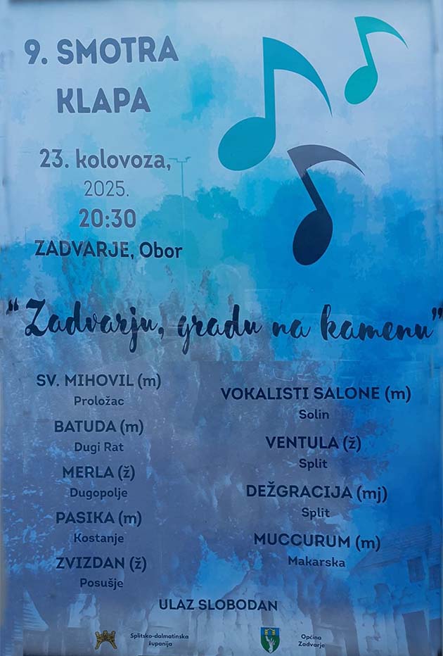 U Zadvarju, malom mjestu Dalmatinske zagore, duge i bogate povijesti u subotu 23. kolovoza 2025. na Oboru, glavnom mjesnom trgu održana je 9. smotra klapa „Zadvarju, gradu na kamenu“. Taj zvučni i gordi naziv manifestacije preuzet je iz „Pisme od grada Zadvarja“, u znamenitoj knjizi „Razgovor ugodni naroda slovinskoga“ Andrije Kačića Miošića.