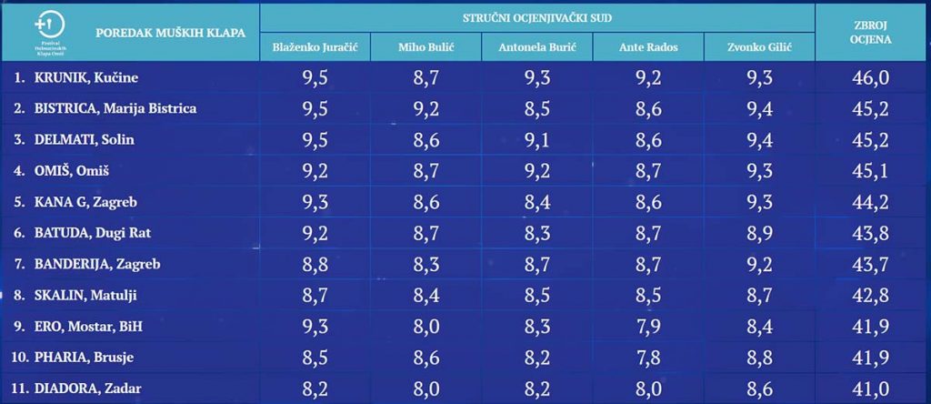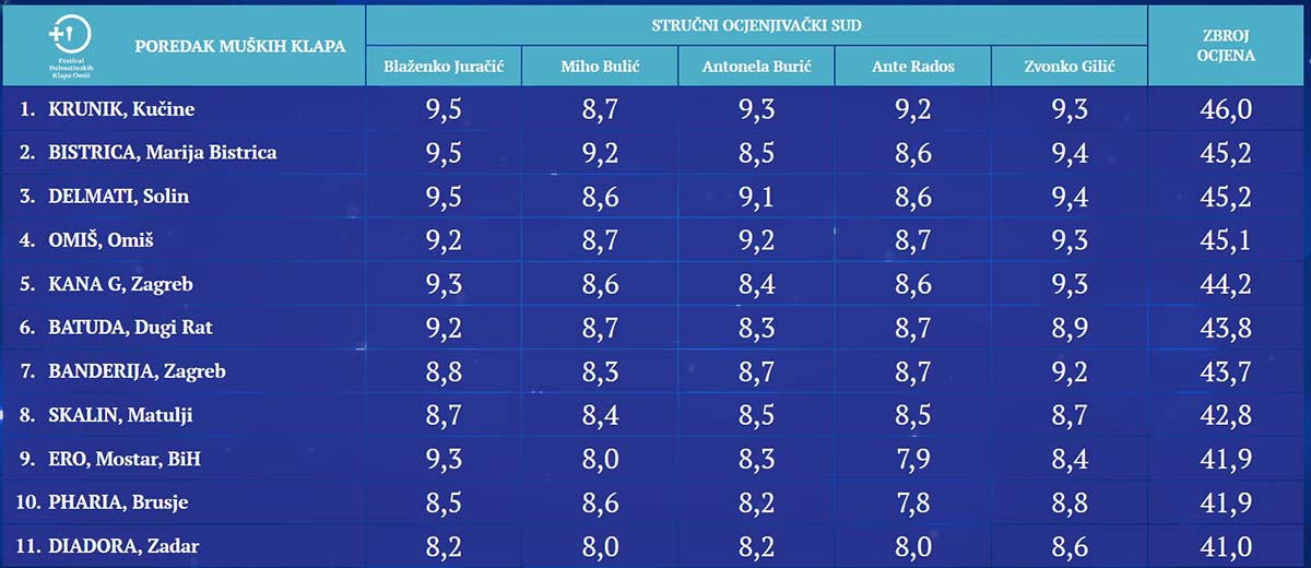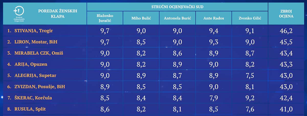 Nakon dvije izborne večeri održane u Omišu u četvrtak 3. srpnja i petak 4. srpnja evo poretka klapa u muškoj i ženskoj konkurenciji.
