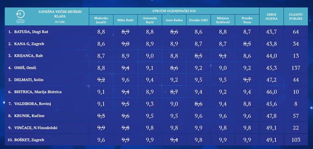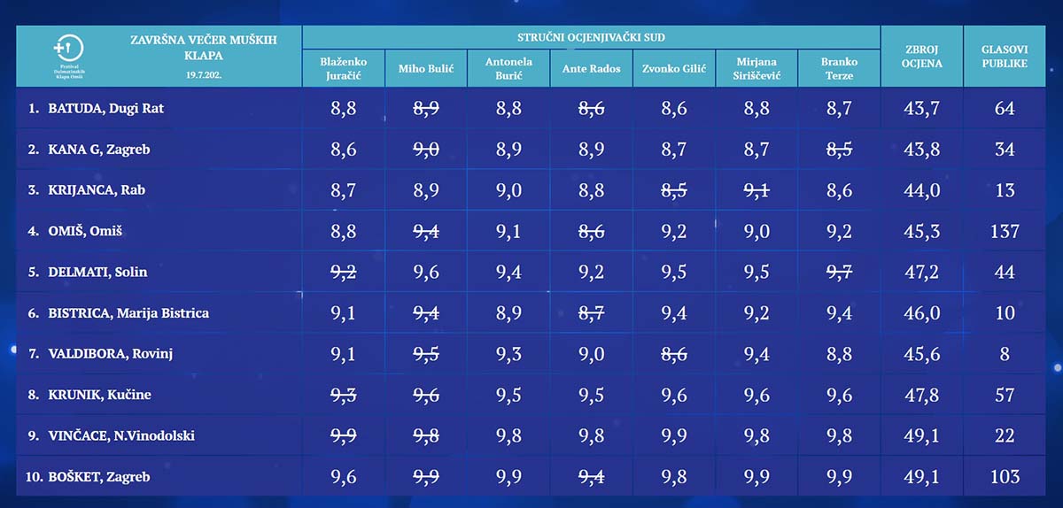 Zanimljivo je to da se dogodila ista situacija kao i prethodne završne večeri. Naime sa istim brojem bodova, ali manjom najvećom ocjenom druga nagrada stručnog ocjenjivačkog suda, srebrni štit s povijesnim grbom grada Omiša pripala je klapi Vinčace iz Novog Vinodolskog, dok je treća nagrada brončani štit s povijesnim grbom grada Omiša pripala klapi Krunik iz Kučina.
