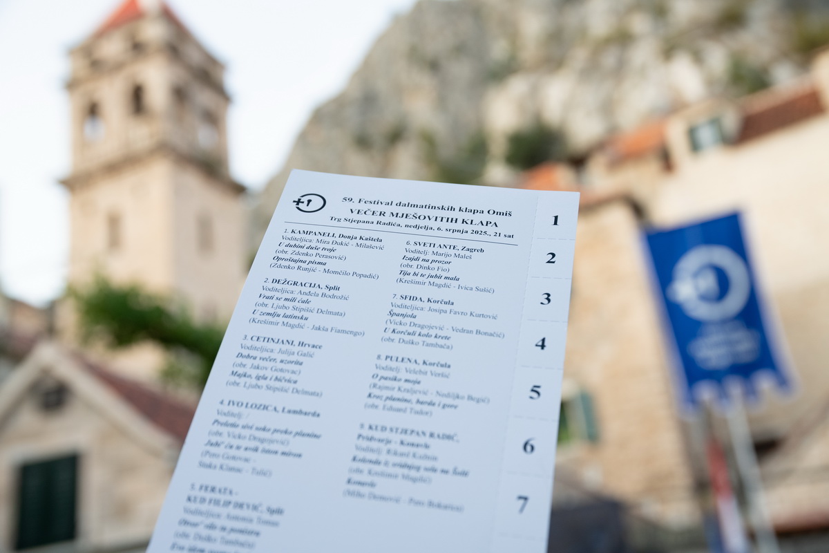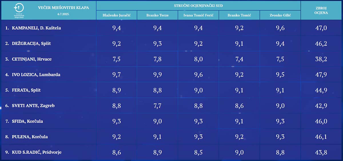 Na večeri mješovitih klapa 59. Festivala dalmatinskih klapa u Omišu, 6. srpnja 2025. godine nastupile su klape: Kampaneli-Donja Kaštela, Dežgracija-Split, Cetinjani-Hrvace, Ivo Lozica-Lumbarda, Ferata – KUD Filip Dević-Split, Sveti Ante-Zagreb, Sfida-Korčula, Pulena-Korčula i KUD Stjepan Radić, Pridvorje–Konavle.