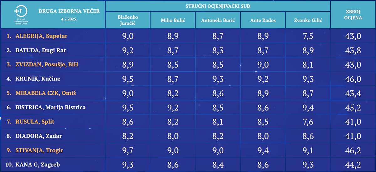 Prema ocjenama stručnog ocjenjivačkog suda koji je radio u sastavu: pjevač i dugogodišnji voditelj klape Maestral – Miho Bulić, klapski pjevač Zvonko Gilić, doc.mr.art. Blaženko Juračić, mag. mus. Antonela Burić i klapski skladatelj i voditelj Ante Rados najbolja je kod muških klapa bila klapa KRUNIK iz Kučina, a kod ženskih klapa STIVANJA iz Trogira.